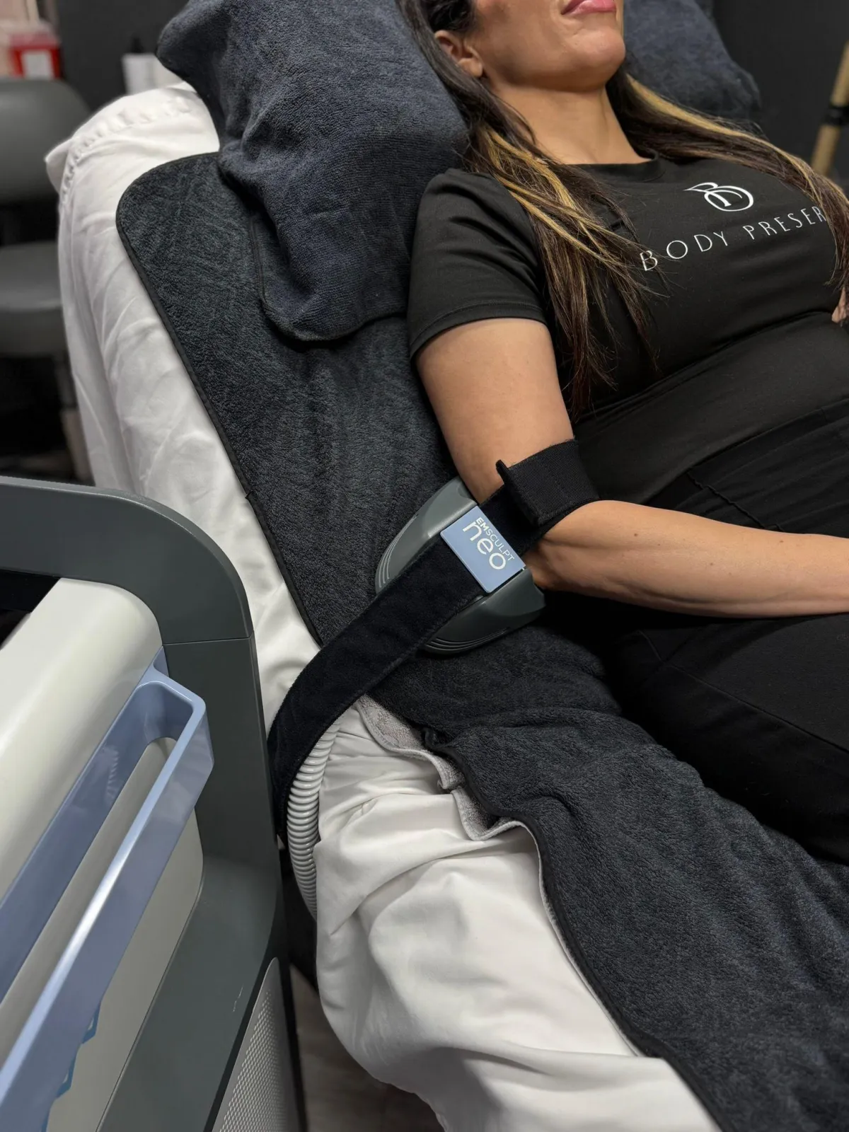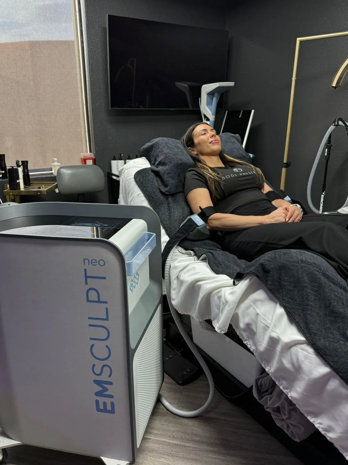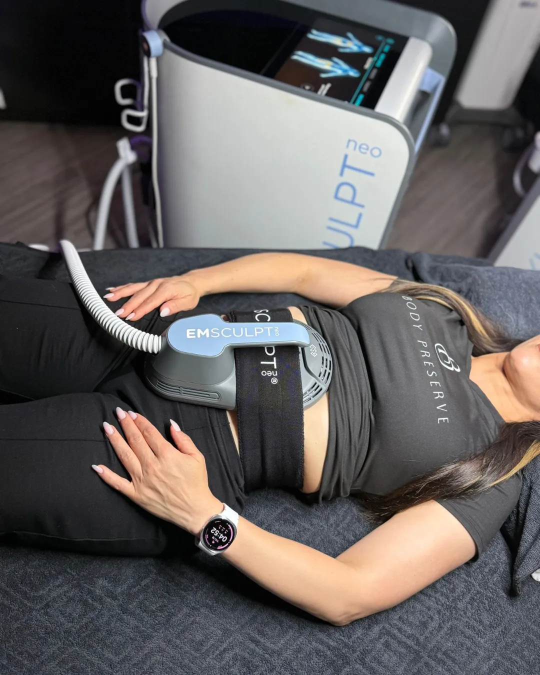Emsculpt NEO can target the abs, buttocks, arms, legs, and thighs. Cryosculpt Skin Tightening is also effective for improving skin laxity in these same areas.